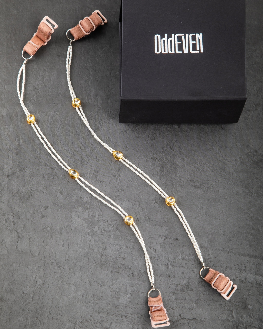 Reimagined kundan jewelry in the form of stylish bra straps. Featuring kundan stones and pearls, these handmade straps are perfect for festive and ethnic wear.
