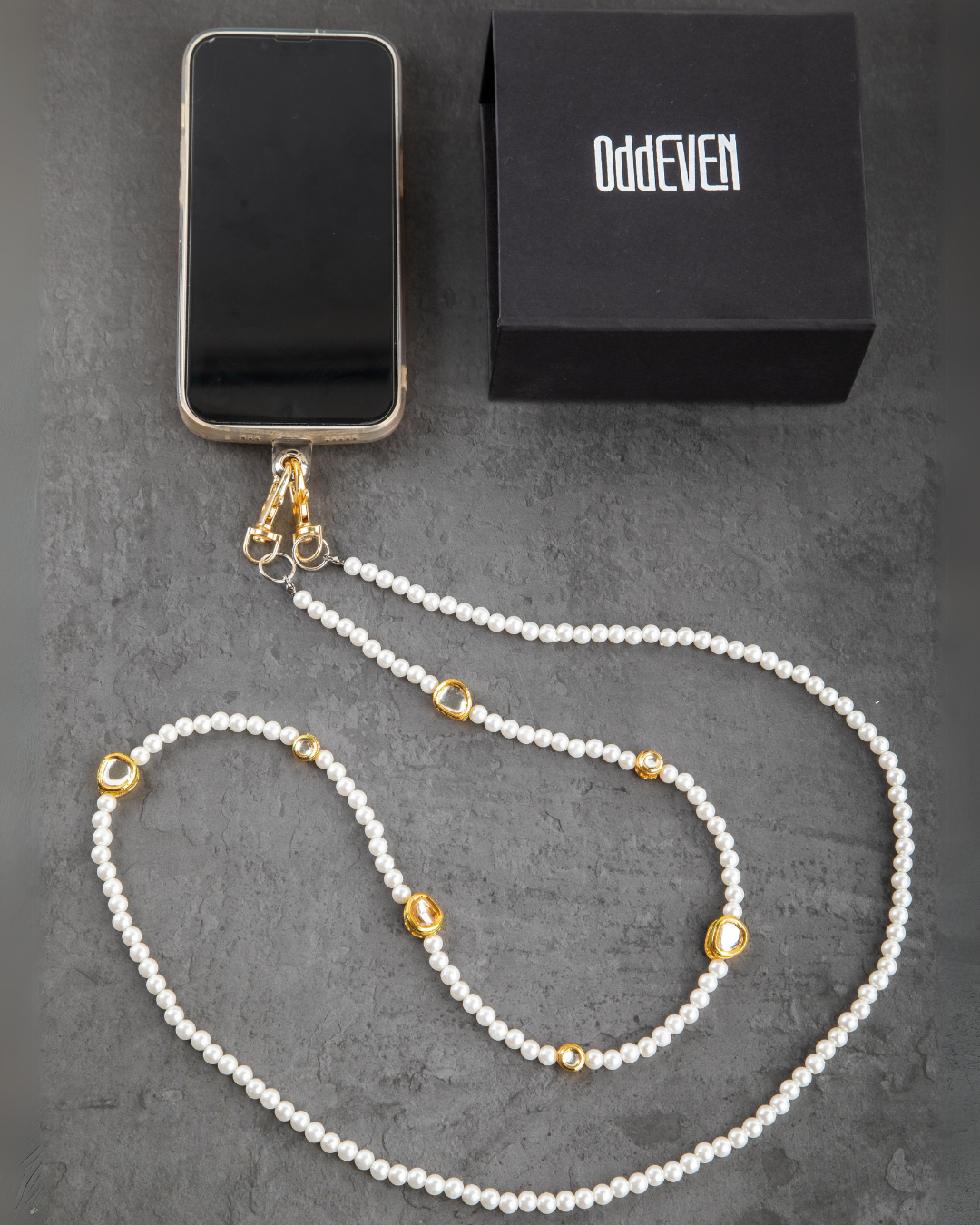 Elegant kundan and pearl phone chain for bags and phones. A timeless blend of tradition and trend, perfect for ethnic and fusion outfits.