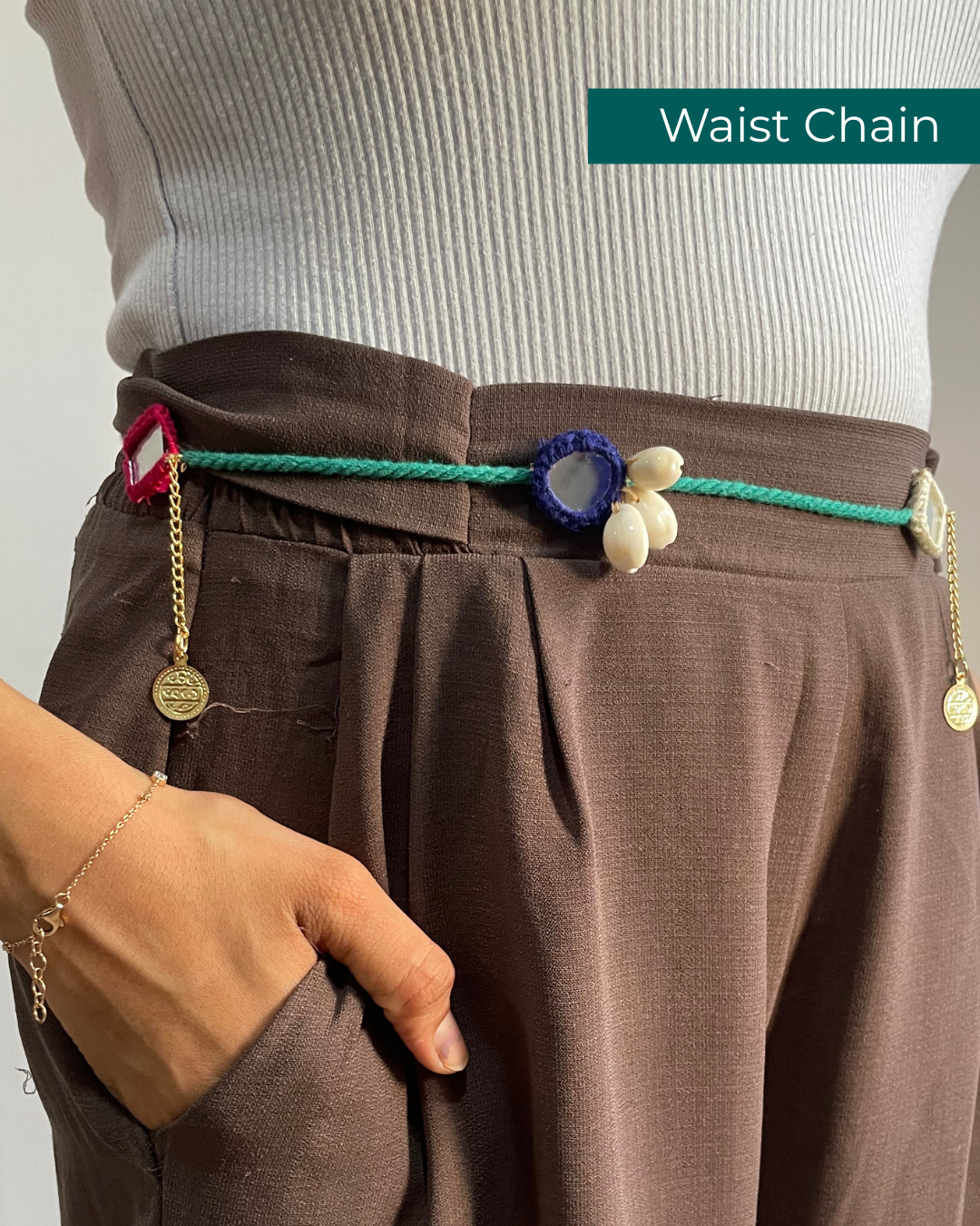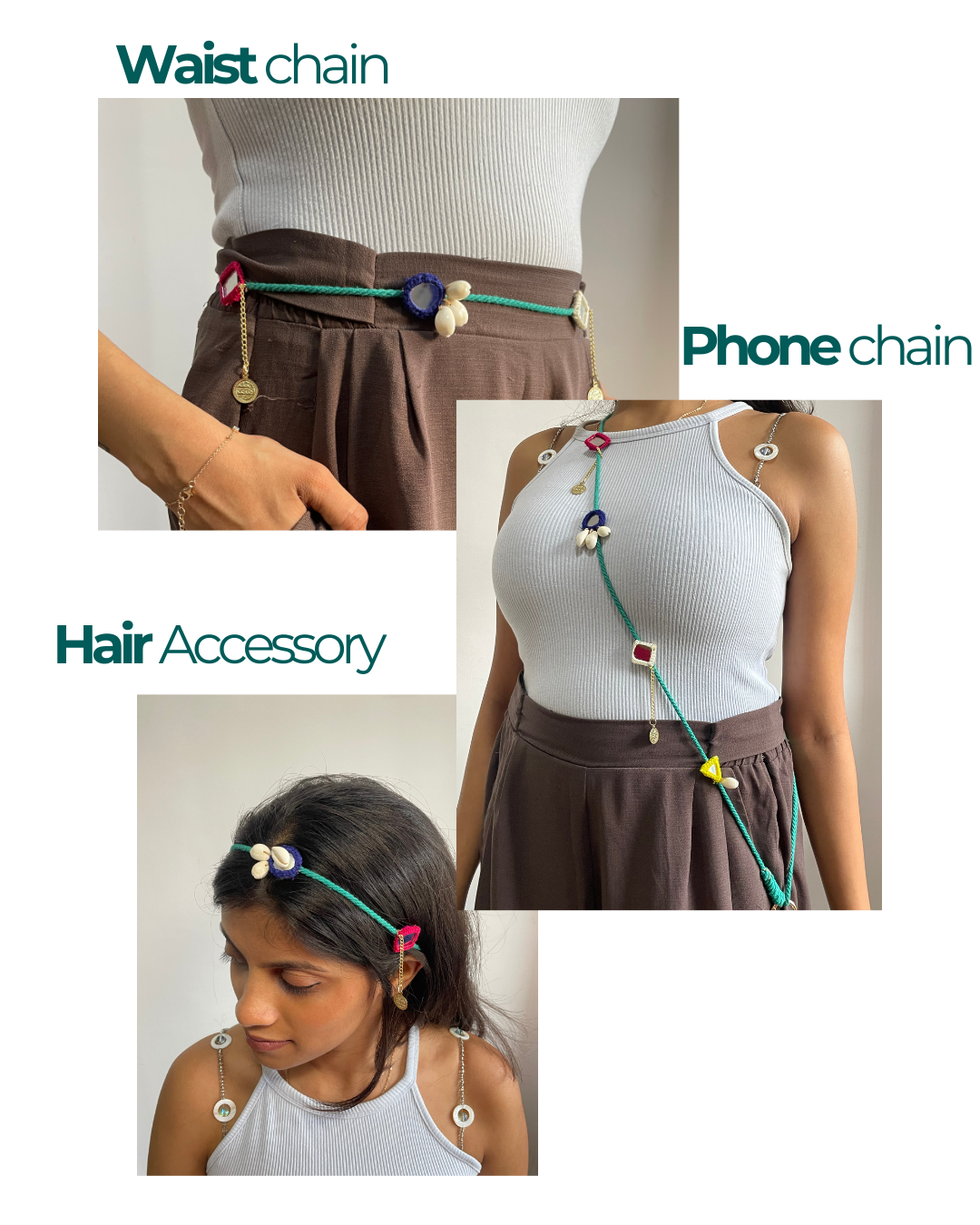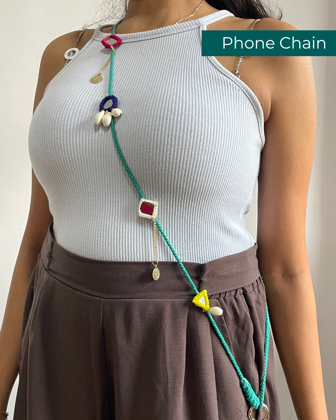Shop OddEven’s Green Boho Phone Chain – a 3-in-1 Navratri accessory. Wear it as a phone chain, waist chain, or hair accessory. Fits all mobile phones.